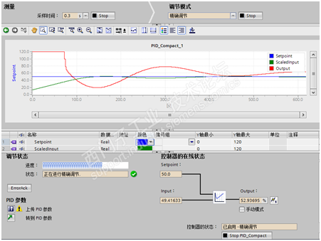 将项目下载到PLC后,便可以开始对PID控制器进行优化调节。优化调节分预调节和精确调节两种模式。