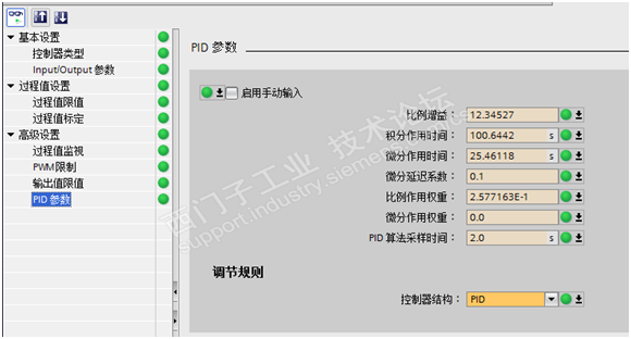 如果经过预调节后,过程值振荡且不稳定,这时需要进行精确调节,使过程值出现恒定受限的振荡。PID控制器将根据此振荡的幅度和频率为操作点调节 PID 参数。所有 PID 参数都根据结果重新计算。精确调节得出的 PID 参数通常比预调节得出的PID参数具有更好的主控和抗扰动特性,但是时间长。精确调节结合预调节可获得最佳PID 参数。
