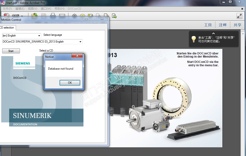 请教下各位,本人安装DOconCD 2013版本出现如图问题,点击START后,弹出对话框提示database not found,请问是由什么引起的啊,安装Adobe acrobat了,但是仍然安装不上,在线求指教,谢谢。