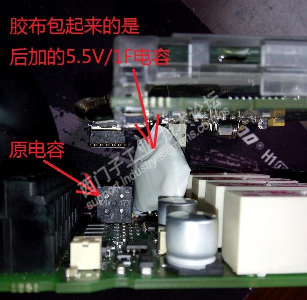 本人菜鸟一枚,刚刚接触学习LOGO,平时编好一个程序学习完后放一边,工作空闲时再拿出来玩弄时原来设定的时间等会消失,看资料0BA5内部时钟保持80小时左右。打开看到内部时钟由一颗NT 0.33F超级电容存储电能保持,于是从元件盒内找来一只松下5.5V 1F的电容引线并上。顺便测了下没上电时电容端压0.87V,接上电源再测却发现电压并不是在几秒内升上去,充了一个小时后才2.23V,于是就一直通电隔断时间就量一次电压。直到第三天上午10:28电容两端电压升到了4.74V,并且随着时间推移这个电压可能还会继续上升。