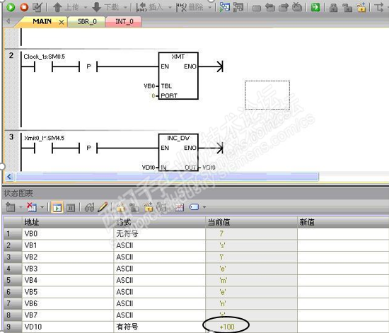 下面图片中的圈出来的地方,按照这个程序分析,"siemens"这几个字符,每发送一个字符,VD0就要加一 一次吗?那这100,是发送这几个字符所计数,还是其他呢?