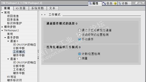 添加完TM PosInput 2模块之后,在TM模块“属性”-->“基本参数”-->“通道0”-->“工作模式”下,为计数通道设置操作模式。由于要读取的信号类型为SSI编码器,故在此处选择“手动操作”模式;通道的工作模式选择“计数/位置检测”,属性的设置如图11- 20所示。