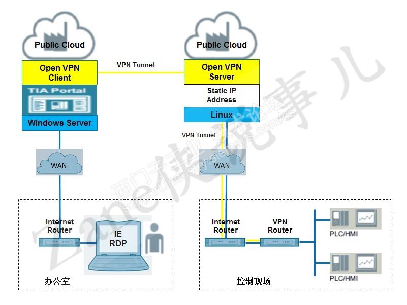 工程师携带未安装博图软件的PG/PC在现场,通过路由器及RDP远程桌面共享软件操作公有云服务器上的的博图软件;博图软件通过VPN服务器及客户端(软件或硬件)实现与现场PLC的连接,进行程序下载与调试。