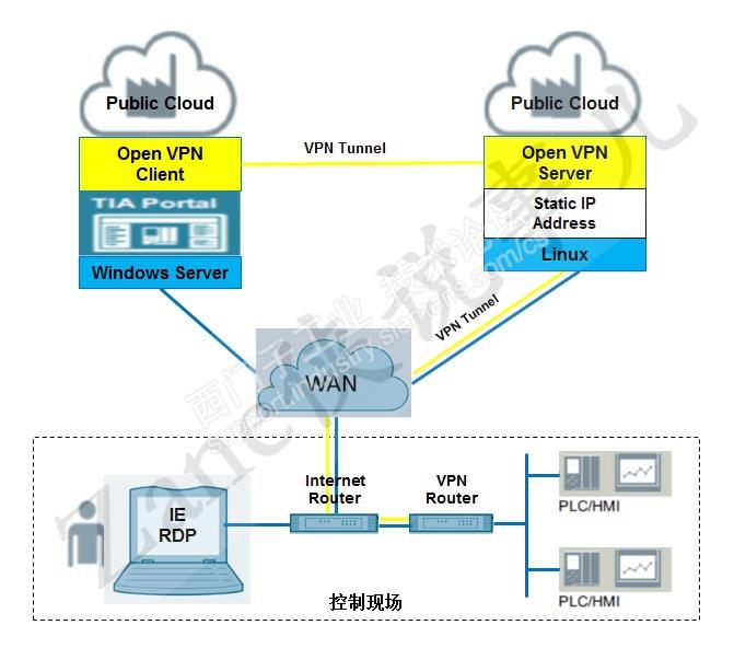 需要建立VPN服务器(固定公网IP),控制现场需要VPN客户端路由软件(非固定IP)