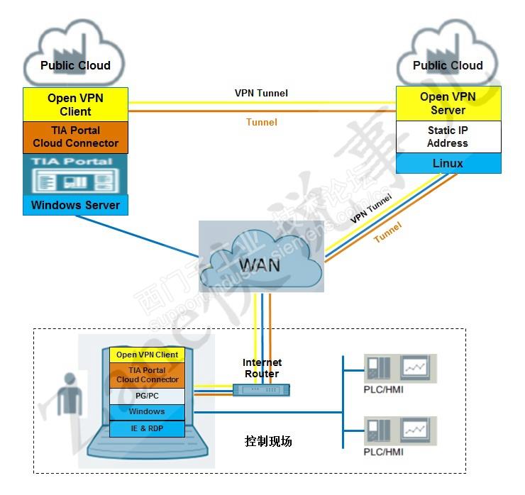工程师携带未安装博图软件的PG/PC在现场,通过路由器及RDP远程桌面共享软件操作公有云服务器上的的博图软件;博图软件通过VPN服务器及客户端(软件)、 Cloud Connector软件,借助现场的PG/PC实现与现场PLC的连接,进行程序下载与调试。