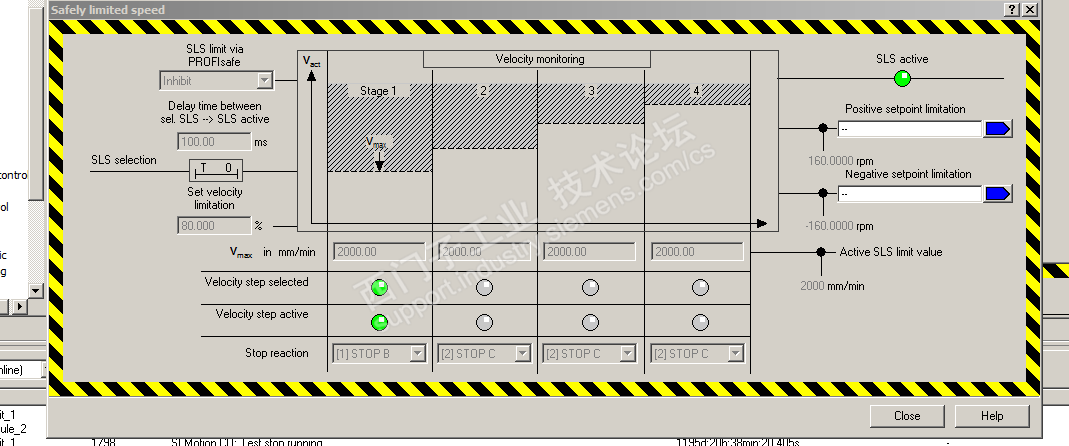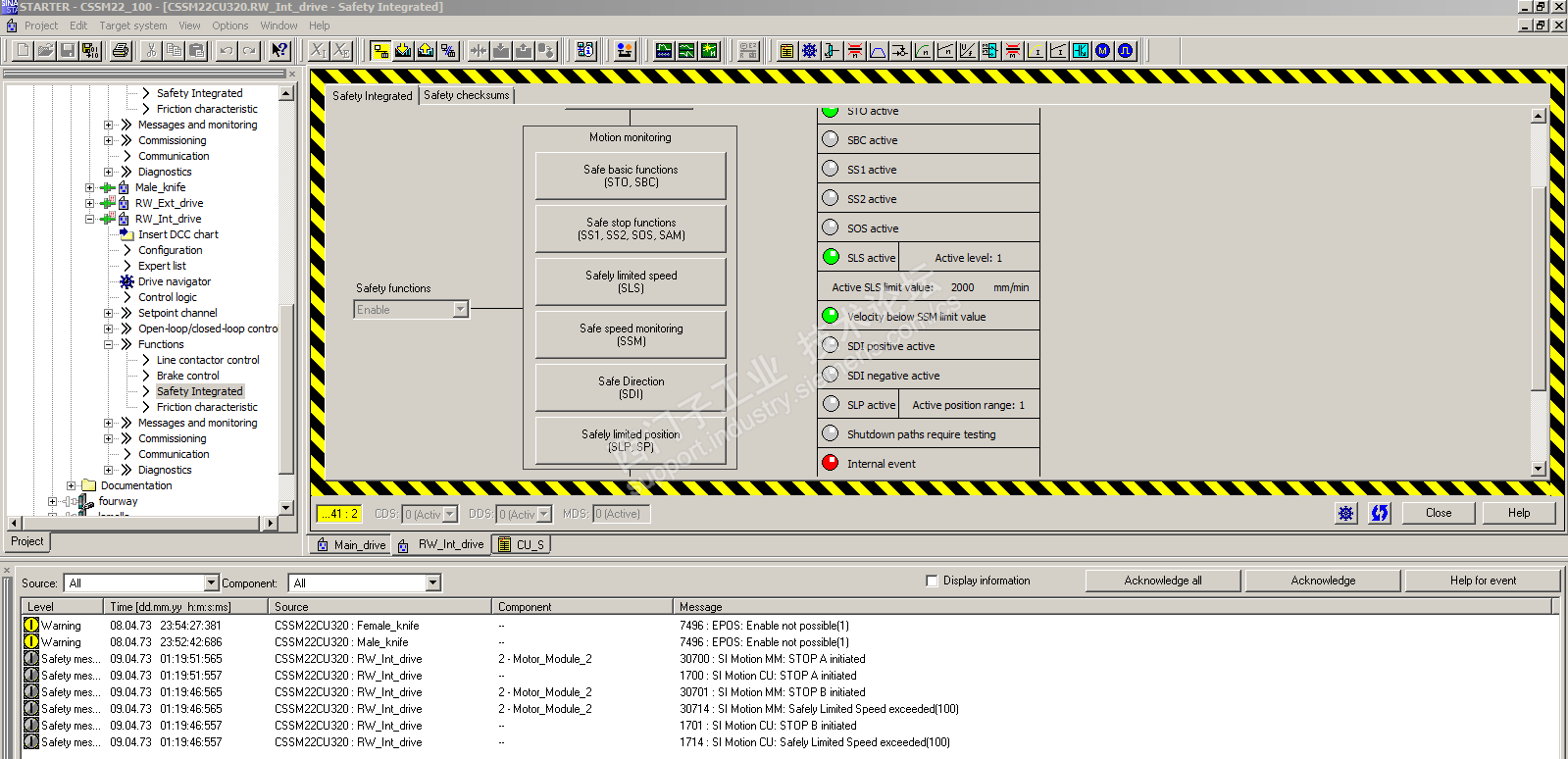 过完节回来开机,发现S120带的2根驱动轴运行时限速安全功能激活停机,无论是上位机控制还是在Starter中用调试面板运行,都一样的问题,以前只用过基本的安全功能,这种带SS1,SLS的自己没配置过,有没有高手帮忙看看哪里的问题,先谢谢了。