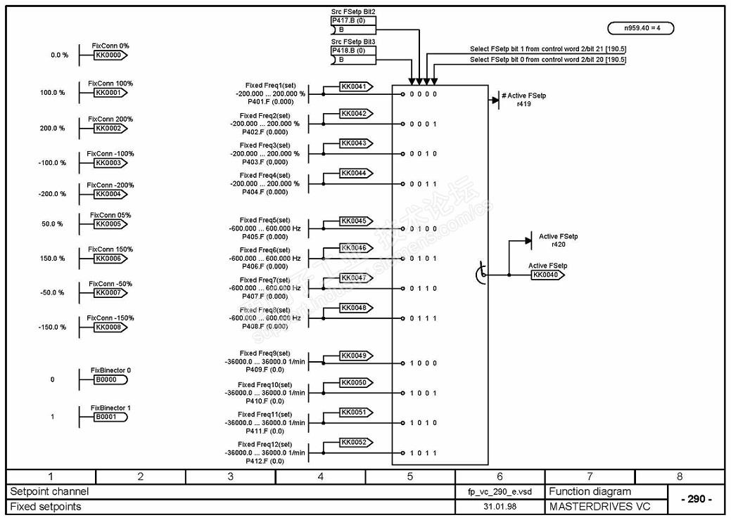 你说的那个n959.40 = 4是系统默认的时隙参数,比不要管,之控制那四个位的信号,选通某一个段速设定值即可。关键是把KK0040链接到给定通道里去如P433 = 40即可。