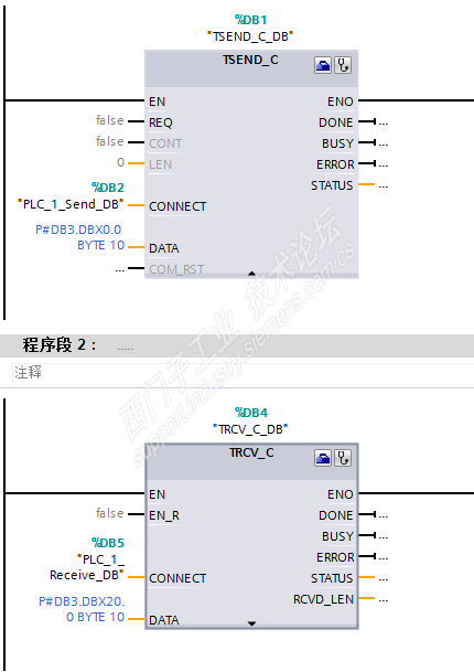 2个PLC之间建立一个连接就可以互相收发了。可以看一下TSEND和TRCV的CONNECT引脚,如果是一样的,那就是同一个连接下的收发了。