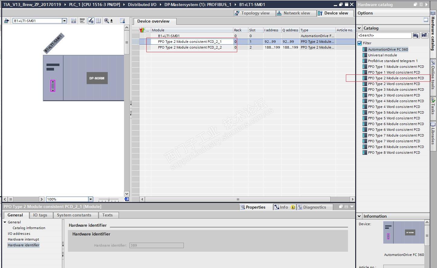 问题发生在硬件组态上,我们组态FC360变频器时,报文类型通常组态Type1,即“PPO Type 1 Module consistent PCD”,组态这个类型指可以读取电机的起停状态、给定大小。但是如果要读取电流值,报文类型需要组态Type2,即“PPO Type 2 Module consistent PCD”。