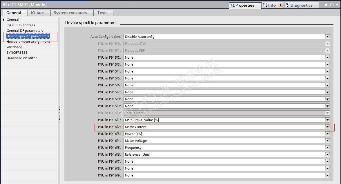 选择完报文类型之后,需要配置参数,选择变频器——属性——变频器参数设置,在P916/2中选择Motor Current,如下图,硬件组态完毕,可以在编程时正常读取电流了。