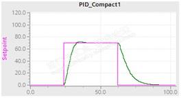 为了观察优化后的参数的控制效果,切换到PID调节窗口。令I0.0为FALSE,过程值下降到0以后,令I0.0为TRUE,使设定值由0跳变到70%,过程变量的响应曲线如下图所示。由图可知优化的PID参数的控制效果是比较理想的。