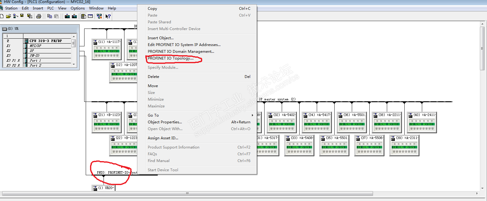 在你的 硬件组态 界面中,选中,PN IO 的总线,右键 ,在快捷菜单中选择 “PN IO 拓扑”