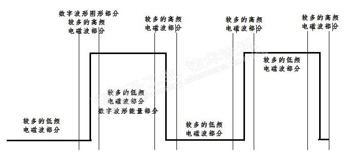 “所有的各种非正弦波形的电磁波和上升下降的开关信号,都包含了各种频段的电磁波,其中就有较易向外辐射的高频电磁波,或者较易接收外部高频干扰而改变波形。”