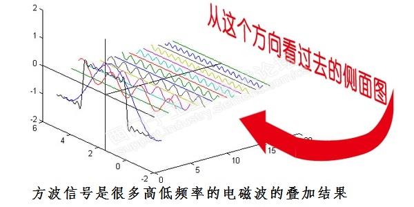 “编码器的信号、数字控制信号,或者微处理器内处理的信号都是方波型数字编码类型的信号,现代数字信号是由数字编码的0和1组合的高低电平变化的方波。上面说到的电磁波的各种频率特性,包括形成在某个频率上LC振荡辐射的频率,是由正弦波的频率确定的。而方波实际上是可以通过傅立叶变换获得各个频率的很多个正弦波的组合叠加。