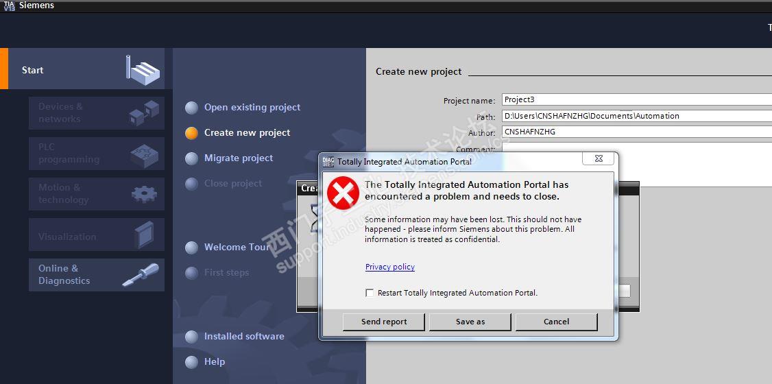 我的电脑WIN7系统64位的,在TIA V13环境下打开,新建项目都时正常的,但是升级到V13SP1后,就出现一下错误,还请有同样经历的分享下解决方案。