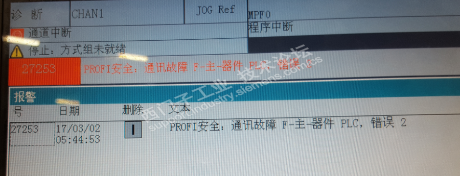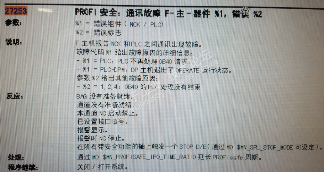 在840DSL试验台上增加了一个ET200S的F DI/DO的安全输入输出模块,原来没有安全集成功能,配置了一下,出现27253的报警,按照诊断手册的说明,也增加了PROFISAFE的周期时间,但报警消除不掉,有人遇过这报警么,在论坛搜了下,没发现这个报警。