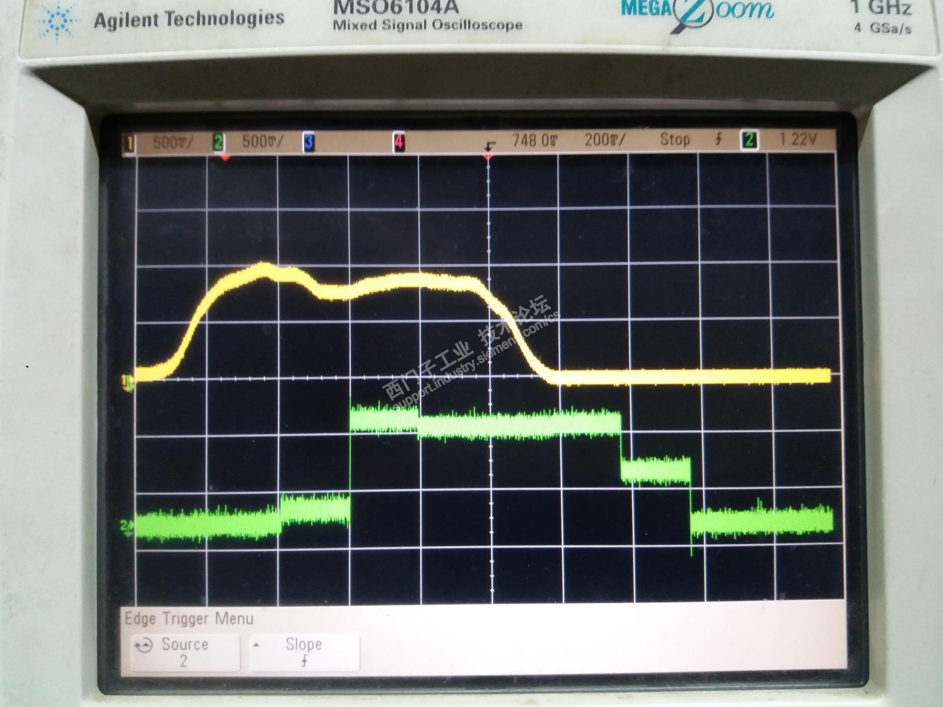 请看示波器照片,黄色是模拟输入波形,绿色是模拟输出波形。两者之间延迟为400ms。