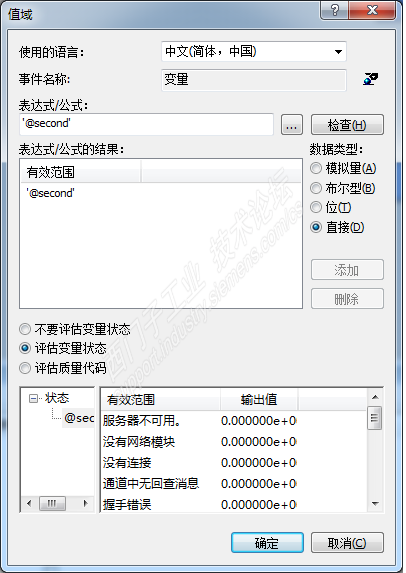 输出域直接组态,然后选中下方的评估变量状态,不同状态时需要输出什么值,自己修改就行