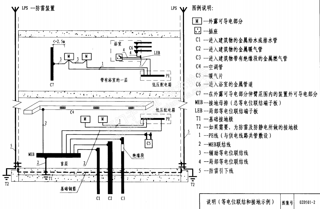 等电位联结:联结的目的就是保证其联结两点及联结导体上电位的相等。需要说明的是,等电位联结分为低频和高频,低频主要指50Hz,主要是基于安全方面的考虑,以及一些工频干扰,所以必须考虑联结导体的载流量;而高频等电位联结主要是基于高频干扰的考虑。