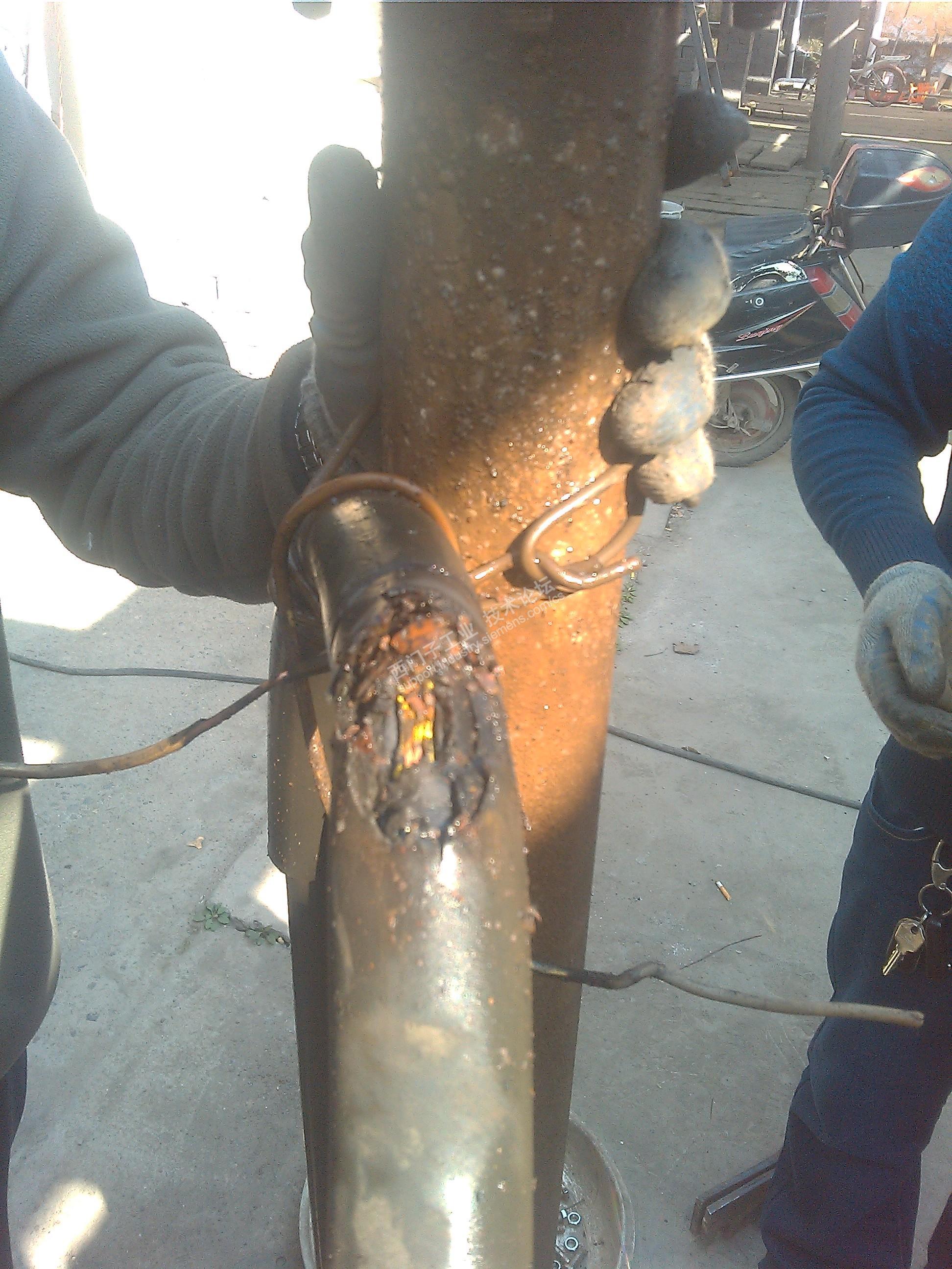 原因(含上两次)应是:观察发现,第5根与第6根及以上,有两处法兰连接处弯曲,导致法兰紧贴井壁。估计原因:法兰与扬水管不垂直或连接时螺丝的用力不平衡,没有对称紧螺丝。处理:剔除不合格品,加保护管,并在多处法兰外焊接了“一个开口的圈”,开口处与法兰原豁口处对齐。