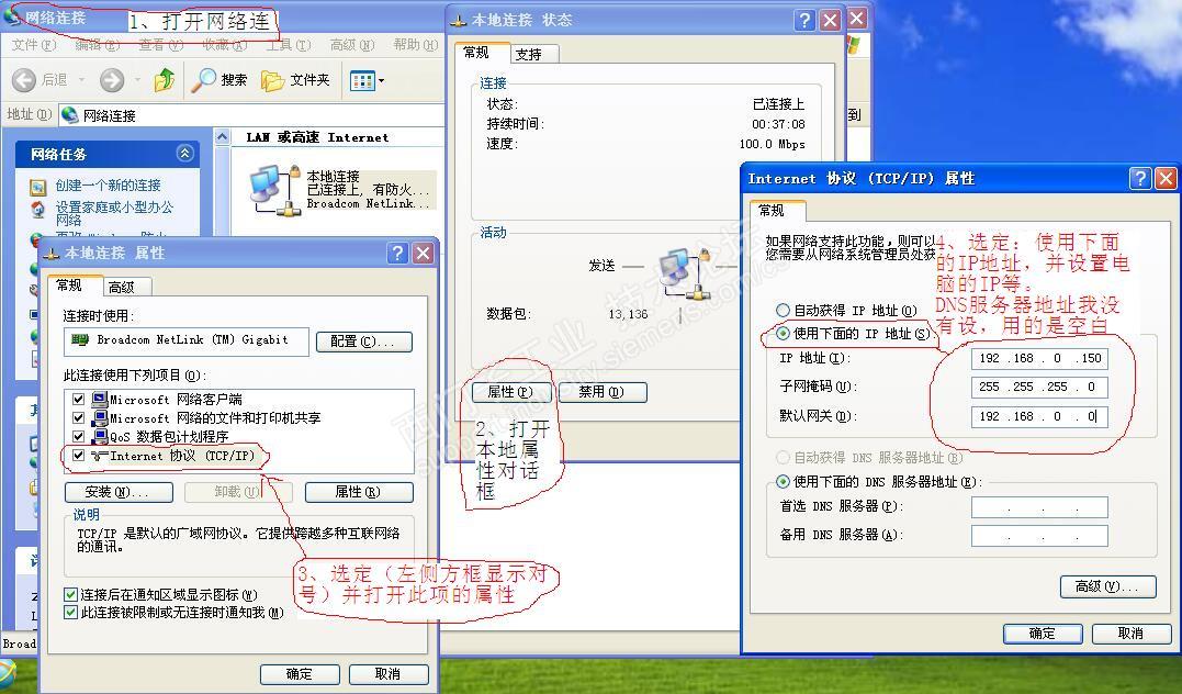 2、电脑采用固定1P、网关、子网掩码。