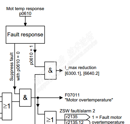 研究了一阵子,我给的判断是西门子给的功能图出错,cu设置的是P0601=0 P0610=12,是普通的三相异步电动机,怎么看,也不可能报F07011,所以说,这个功能图出错啊,cu240e-2dp,版本V4.7.