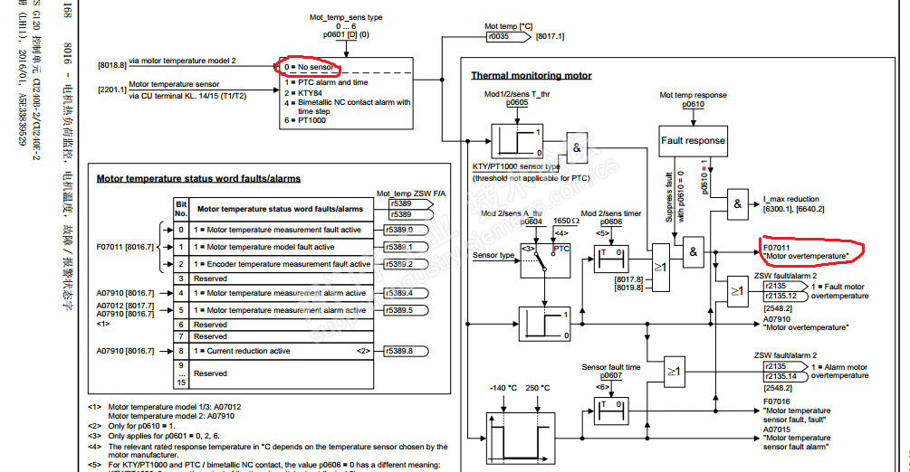 CU版本是V4.7. cu240e-2dp变频器报f07011,电机是没有温度传感器的,现在这个报警如何理解,我这个功能图,我看来看去,不知道怎么个走向,变频器专家列表里没有P0606,没有p0607, 怎么个逻辑,说一说