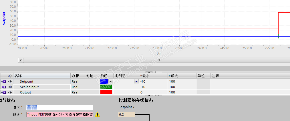 问题:在使用S7-1200PID调试时(使用的是Portal V13),已经在组态中设置“错误未决时的控制器输出行为”为“当前值”,但是在精确调节即将结束的时刻,在调试面板中的波形图中发现输出波形振荡,最终导致调试失败。错误有时显示“Input_PER参数的值无效”,有时显示“无法维持过程值的振荡而错误”。这样的情况应该如何处理?