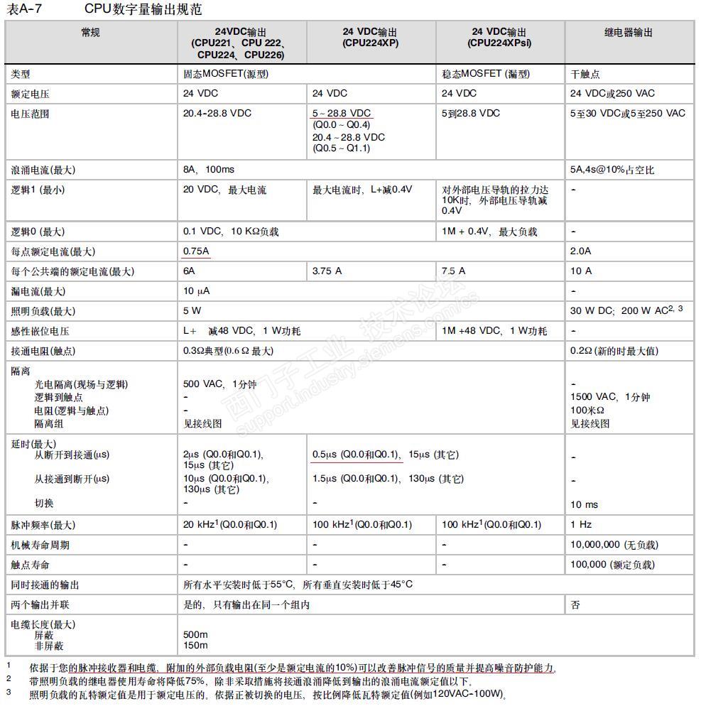 对比资料:1. 200的系统手册中,CPU224XP 的Q0.0-Q0.4电压范围 为 5-28.8VDC,从断开到接通 0.5μs(Q0.0和Q0.1 ),从接通到断开 1.5μs(Q0.0和Q0.1 ),输出点--每点额定电流0.75A。关于脉冲,有提示--附加的外部负载电阻(至少是额定电流的10%)可以改善脉冲信号的质量并提高噪音防护能力。