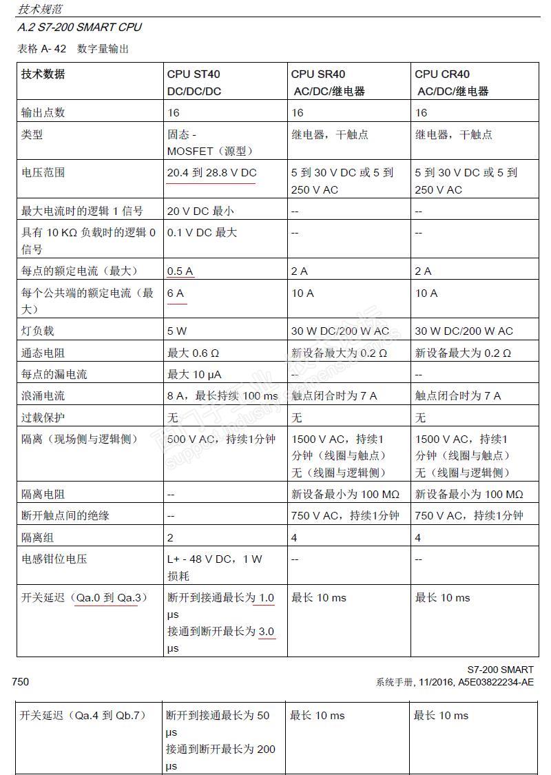 2. smart的系统手册中,CPU ST40 的输出点 20.4-28.8VDC,从断开到接通 1.0μs(Q0.0-Q0.3 ),从接通到断开 3μs(Q0.0-Q0.3),输出点--每点额定电流0.5A。