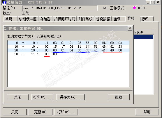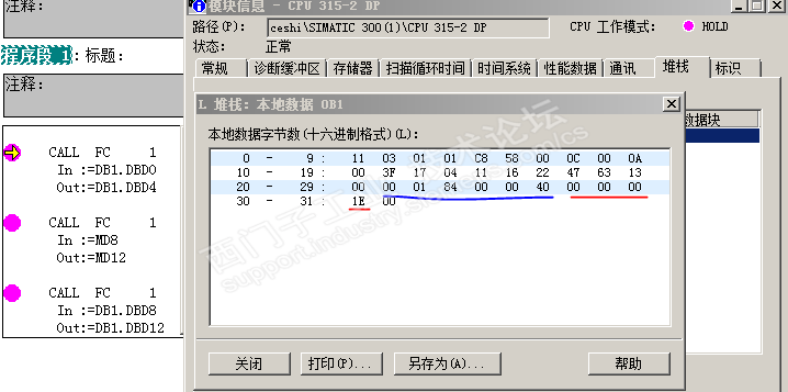 我们可以看出LB21-LB26:00 01 84 00 00 00为Pointer地址,对应为DB1.DB0.0,即传输给FC1的输入值对应的地址;LB27-LB30:00 00 00 0A为输出DB1.DBD4的值。