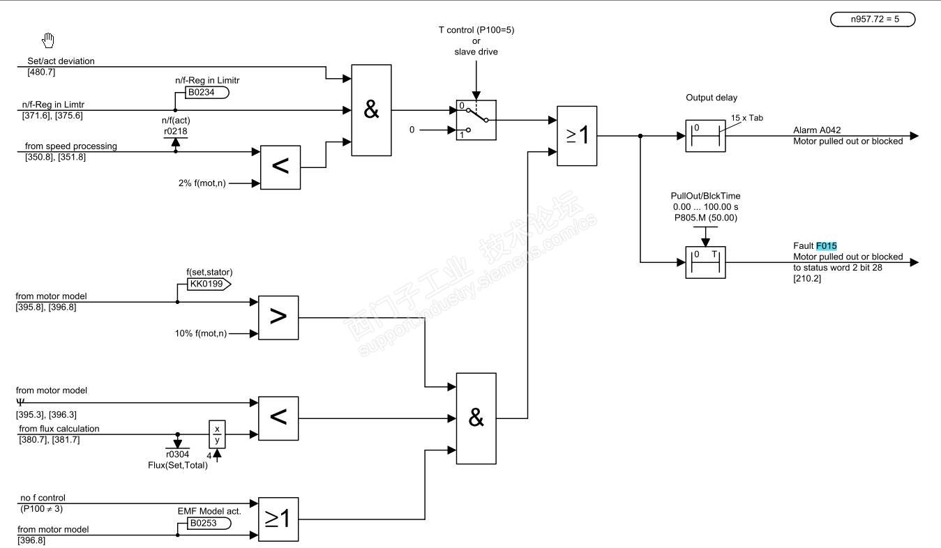 斜坡发生器的扫描周期比较长,所以不起作用了。从功能图485看,F015必须在P805设置的延时时间后生效报出,但P805设置的是2S,给定20MS的跳变也不至于报出故障呀,搞不明白