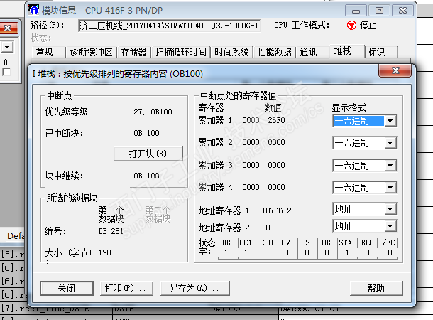 在第二次CPU上电时程序停止在第二张图荧光位置。I堆栈状态如下图所示。