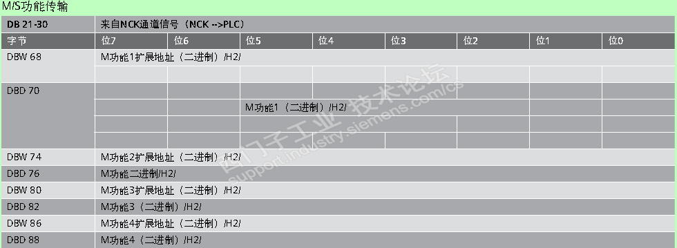 第一类、通道动态M代码M00到M99,共有100个为来自NCK通道信号(NCK -->PLC)(read only 信号只保持一个PLC周期)。对应plc地址DB2X.DBB194到DB2X.DBB206,使用方法为当NC通道1中程序执行M00时对于DB21.DBX194.0接通一个plc扫描周期,可以用置位开关保持信号以控制外部动作比如冷却液开关。