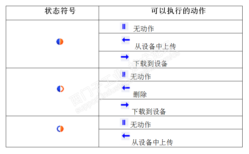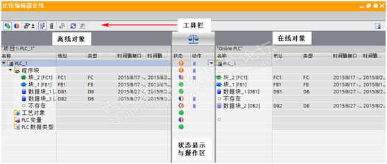 通过工具栏中的按钮可以过滤比较的对象、更改显示视图、更新视图,以及对有差异的对象进行详细比较和操作。如果程序块在离线和在线之间有差异,可以在操作区选择需要执行的动作。执行的动作与状态有关,状态与执行的动作关系参考表14- 2。