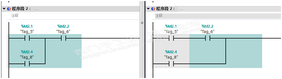当程序存在多个版本或者多人维护、编辑项目时,充分利用详细比较功能可以确保程序的正确执行。在比较编辑器中选择离线/在线内容不同的程序块,双击工具栏中“开始详情比较”按钮,可以获得具体的比较信息,如图14- 24所示。编辑器将自动列出不同的程序段并使用颜色进行标识。