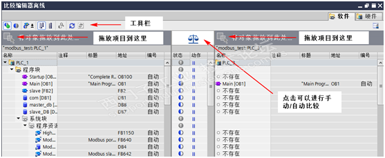 离线/离线比较时需要将整个项目拖拽到比较器的两边,如图14- 25所示。点击手动/自动切换按钮可以选择比较的形式。手动模式可以比较相同类型的程序块,而自动比较模式将比较相同类型并且相同编号的程序块。离线/离线比较除了可以比较软件外,还可以比较硬件,但是存储在库中的项目不支持硬件比较。