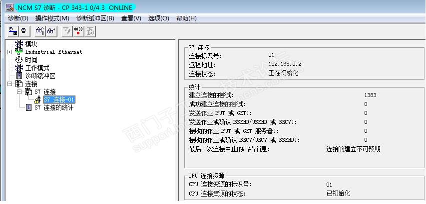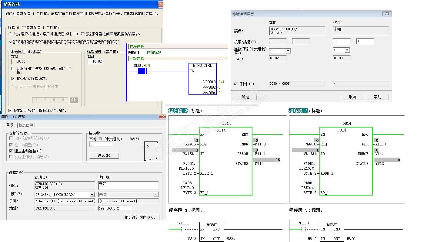 我把S7200设为客户端,就可以和S7300数据通信,但是把S7200设为服务器,TSAP分别为10.00和10.02,S7200已用SM0.0加载了ETHO_CTRL,S7300 FB14的ADDR_1写P#DB1.DBX10.0 BYTE 2 应该对应VB10 VB11,RD_1写P#DB1.DBX0.0 BYTE 2 对应本地DB2.DBB0和1,REQ用系统时钟触发,NDR就一直=0。S7200的CP243我试过已和电脑通信上,可以监控S7200的程序。就是数据传送不了。FB14我分别试过用系统2个不同的功能块,都通信不了。我CP343是343 1EX30,在S7300在线诊断S7200一直显示正在初始化,请帮我看看我发的图片