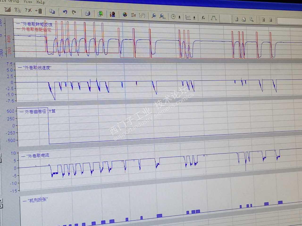 是的,今天又出现了内卷曲、外卷曲电机同时反转的现象,查看程序内的速度给定是负的。由于车间急于生产,没有办法查看更多的数据,只好将PLC复位后,重新开机又正常了。下面是调出的故障时的记录曲线图:卷径,转矩反馈,电流值及速度给定都是负值