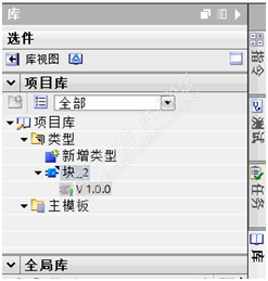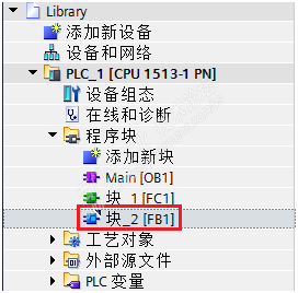 如果在项目树下的PLC_2中也需要使用该程序块,可以直接将项目库->类型下的“块_2”拖放至该站点程序块目录下使用,同样在PLC_2下也可以看到该程序块的右上角带有黑色的小三角符号。