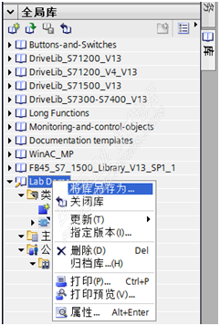 修改完全局库文件之后,在库文件上右键单击,在弹出的菜单中选择“保存库”,即可将全局库保存。如果需要将全局库拷贝给其他用户使用,则可以有两种方式将全局库保存为副本:一种方式是以库文件夹的形式进行保存。例如,在库名称上点右键,选择“将库另存为…”,之后选择存储路径,如图15-16所示。以这种方式保存的库文件可以在其它安装了TIA博途的PC上通过全局库下的 “打开全局库”按钮直接打开;另一种方式是以库压缩文件的形式进行保存。例如,在库名称上点右键,选择“归档库”,之后选择存储路径,将库文件保存为一个后缀为“.zal13”的压缩文件。需要加载时,鼠标在全局库空白区域点右键,之后在弹出的菜单中选择“恢复库”,并选中该压缩文件之后,即可实现对该库文件的恢复。