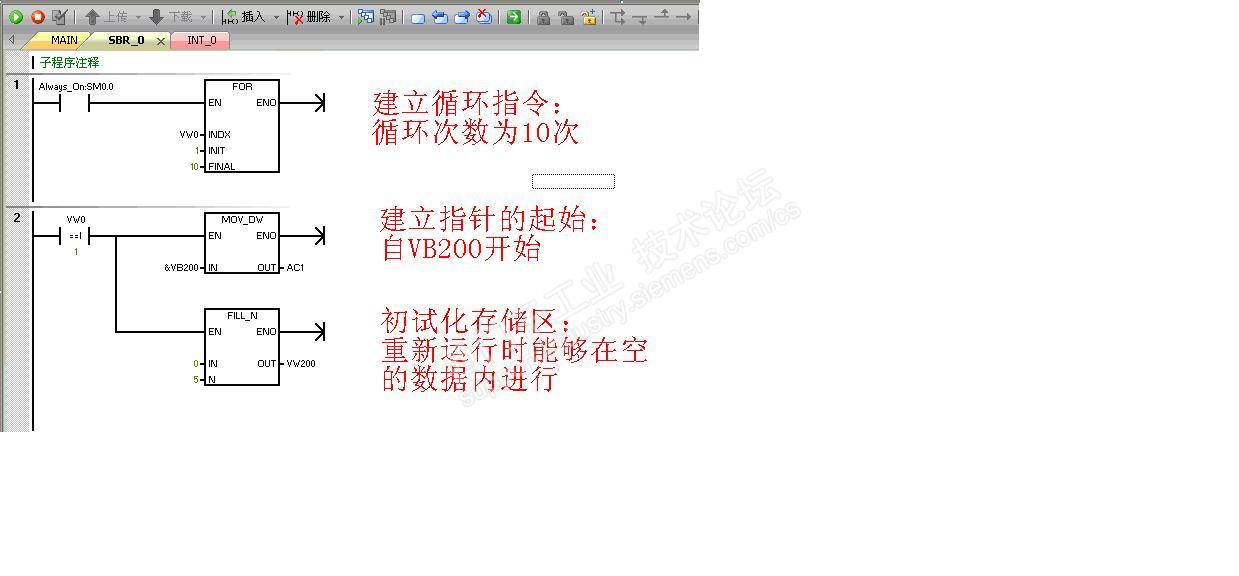 当调用循环第一次时,首先建立指针地址区,并将需要运算的数据归零后VB100地址通过INC_B指令加1后等于VB100 = 1,将这个1的数据传送给已经指定好的指针首地址中完成后,指针地址下移一个字节,为下一个循环准备;当程序扫描到NEXT返回,同时循环指令INDX值(VW0 = 1)。自FOR重新第二次循环,这时,VB100将由1通过INC_B指令加1变为2,这个2的数据通过传送指令传送给在第一次循环准备的指针地址VB201中,完成后指针地址仍然再下移一个字节,当第二次扫描到NEXT后返回,同时循环指令INDX值(VW0 = 2),自FOX重新开始第三次循环,、、、、、、,如此循环直到指定循环次数10次。当循环次数等于10次后,指针指向的地址区由VB209重新返回到VB200,为下一次程序循环运行做好了准备。