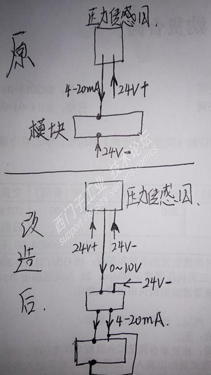 设备上一个压力传感器(型号:MPC250I)坏,其为输出4-20MA信号进入西门子模拟量模块(型号{331-7kf02-oabo),现无此备件,改为PA9021型号传感器(此传感器输出0-10V信号),我通过安装一变送模块,将0-10V变送为4-20MA,接入模块中,接入查看触摸屏值显示满量程,即在程序中就显示32768。注:(电流正负都对,电流在14MA左右)修了一天了为什么有电流进入但是程序中就是满量程呢!!!