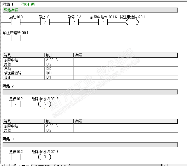 如下,我的理解是网络2里的急停I0.2是常闭触点,不按的时候是一直为1状态,它连的是故障中继置位就是说网络1里面的故障中继为接通状态,置位针对常闭触点来说就是线圈保持通电,所以输送带保持正常运转;