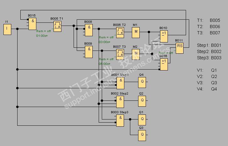 看图应该能够理解思路的吧?T2触发时,用来使能B011让下次T1触发的是T3,然后T3触发时复位B011让下次T1触发T2,如此循环。