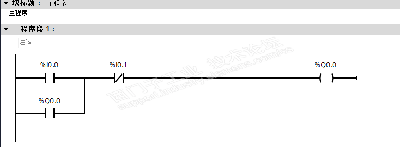 在主程OB1在设计了上图的启保停电路,编译后下载到PLC,短接 I0.0 使 Q0.0 动作。
