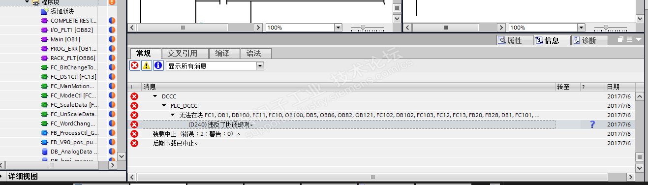 今天用博图V14编写的程序,编译正常,但在下到模拟器时,报D240违反了协调规制,起初是一个功能块报,软件重新编译后,所有的程序块和DB块都报错。