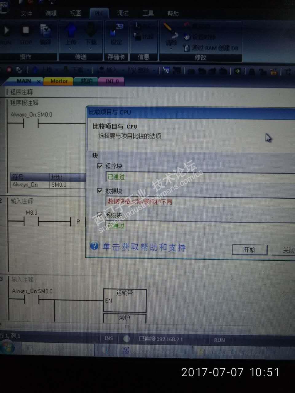 在现场,我用笔记本电脑上传SR40 PLC程序 的时候,可以正常上载来,但是,我上传上来的程序,马上在线比较,就报如下图的错误,这个怎样解决,谢谢各位大咖!!1