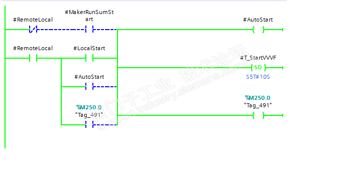 这段程序中当LocalStart接通后,与之并联的AutoStart为何没有接通?也就是LocalStart这个按钮没有自保住,后来另外并联M250.0触点,再加线圈M250.0,当LocalStart接通时依然没有被自保,请问问题出在哪?这是用博途写的400的程序。
