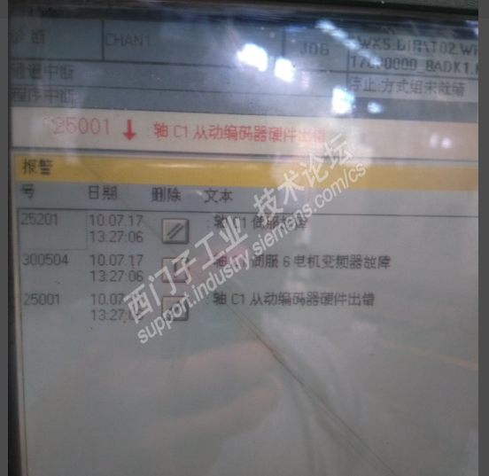 清洗安装后上电,开机正常后按下“FEED START”后报警,出现如图3报警“25201 C1伺服故障”“300504 轴C1伺服6电机伺服器故障”“25001 轴C1从动编码器硬件出错”。